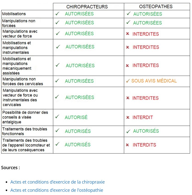 La chiropraxie et l’ostéopathie ne disposent pas du même champ légal. Le décret d’actes permet une plus grande autonomie aux chiropracteurs.